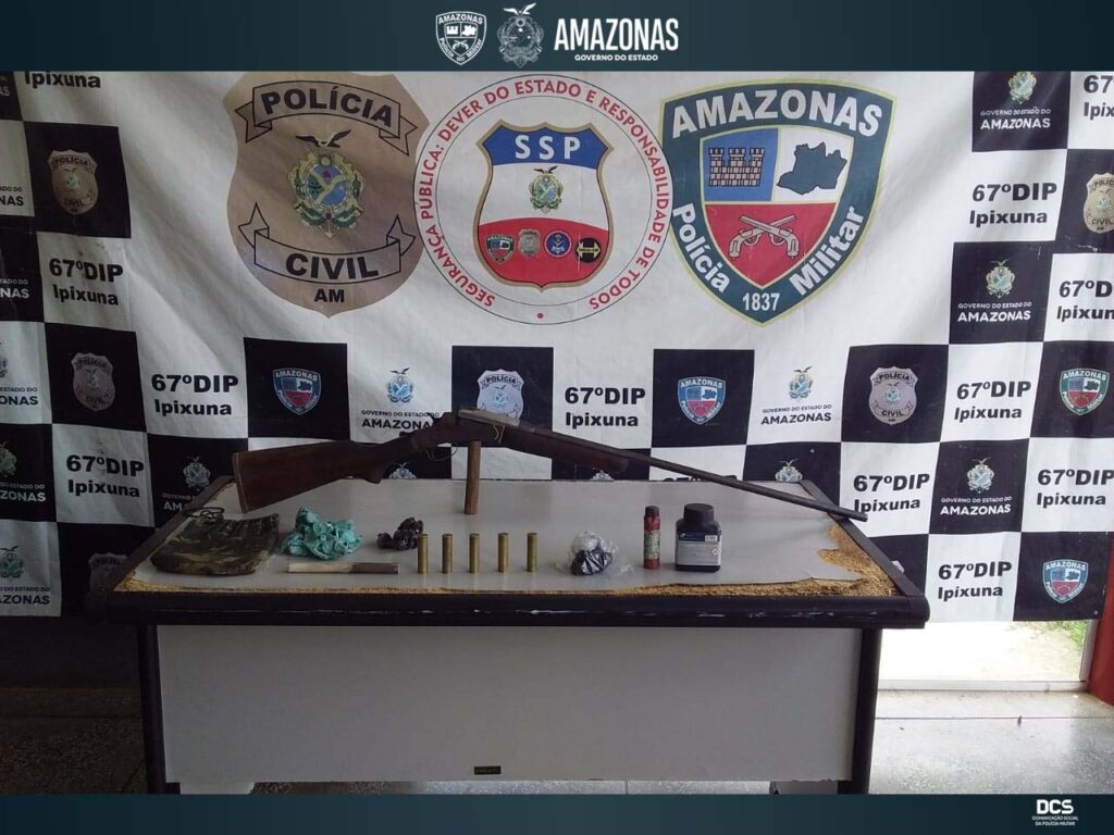 Policiais militares do 8º GPM prenderam um homem de 23 anos por porte ilegal de arma de fogo em Ipixuna (distante 1.367 quilômetros de Manaus). Durante revista pessoal, foi encontrada uma espingarda calibre 28 com cinco cartuchos e munição, pólvora, espoleta, chumbo e outros materiais utilizados para recarregar os cartuchos. O homem e os materiais apreendidos foram apresentados na 67ª Delegacia Interativa de Polícia (DIP).