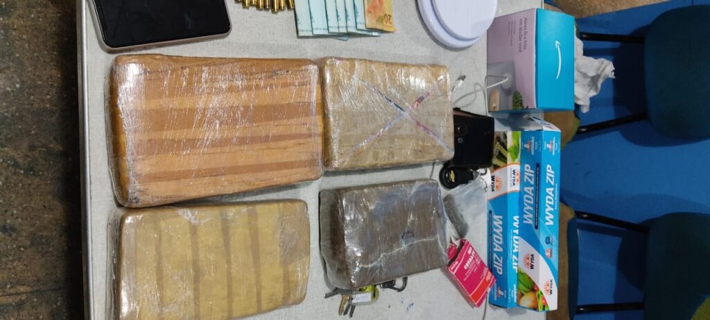 Na ação foram apreendidos quatro tabletes de skunk, somando 4,149 quilos, dois aparelhos celulares, R$ 6.634,00 em dinheiro, oito munições de calibre 380 intactas, três caixas de material de embalo e duas caixas de som.