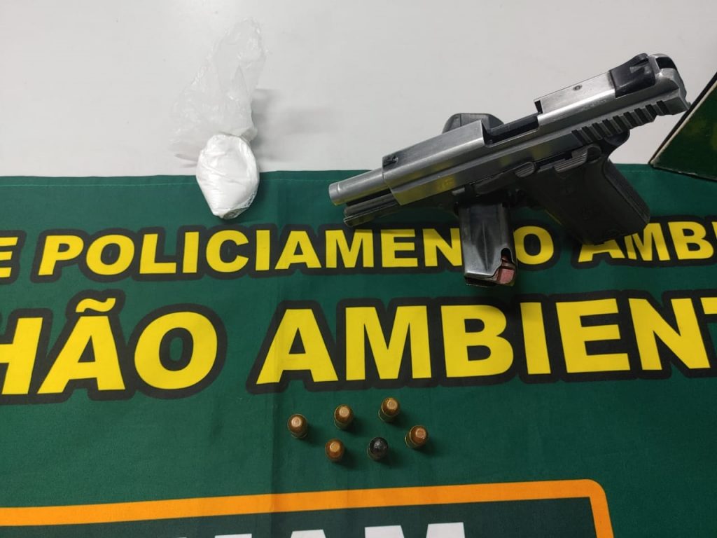 A ação policial militar ocorreu durante patrulhamento de segurança na área da Manaus Moderna. Durante revista em passageiros de uma embarcação do tipo motor de linha, os policiais apreenderam uma pistola marca Taurus 940 e uma porção média de entorpecente supostamente cocaína. O material estava em posse de dois suspeitos, um dos quais levava a arma, e o outro, o material entorpecente.