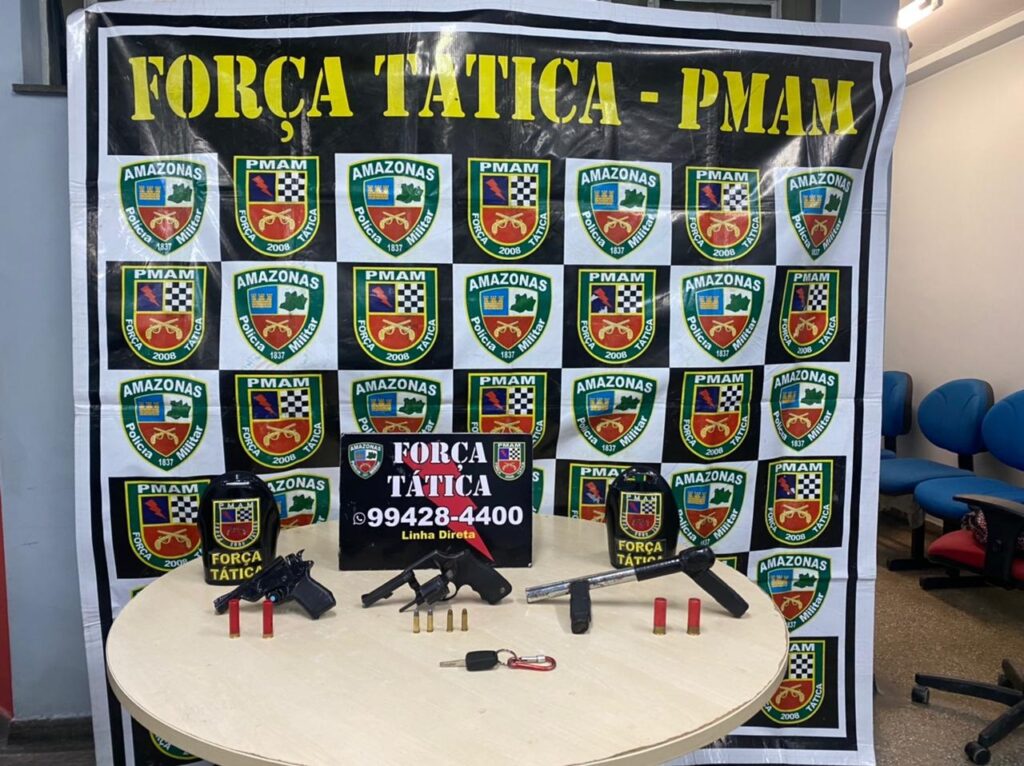 Nas buscas feitas dentro do veículo, os policiais encontraram uma escopeta cano curto, numeração aparente com duas munições intactas; uma arma de fogo de fabricação caseira, calibre 12 com duas munições intactas; além do revólver Taurus, calibre 38 de propriedade da Polícia Militar do Amazonas, com numeração suprimida e quatro munições intactas, que estava em posse de um dos passageiros.