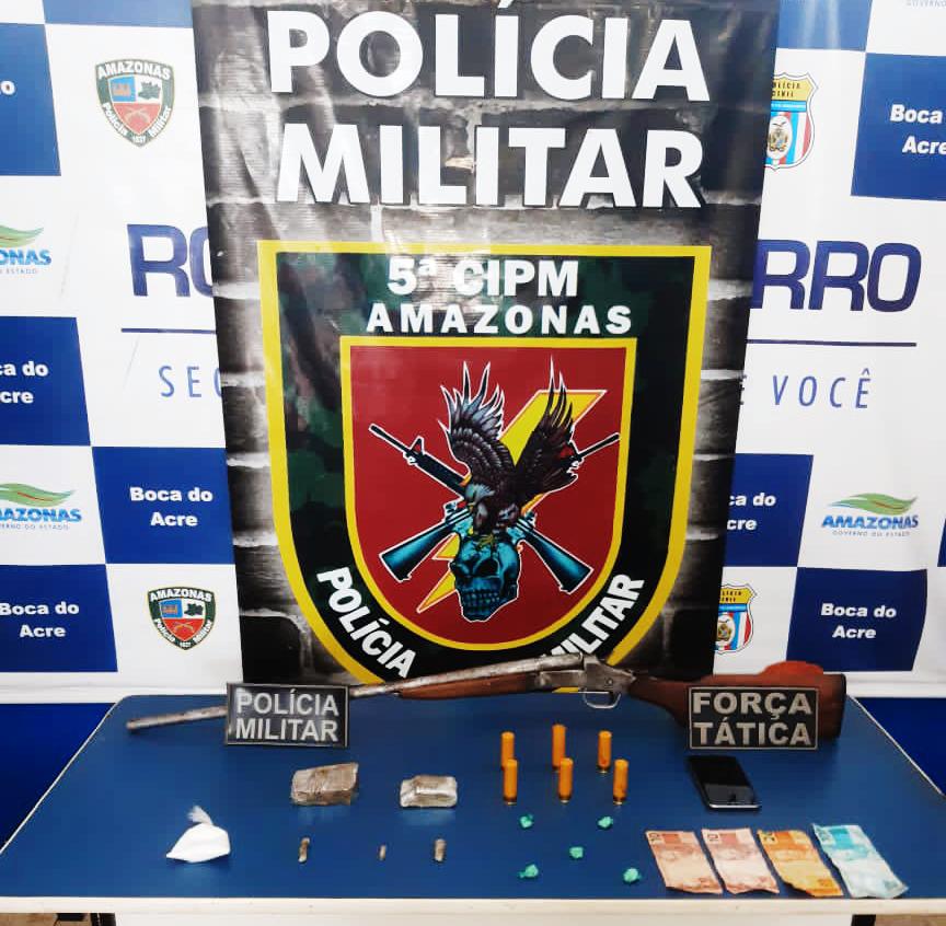 Policiais militares da 5ª Companhia Independente de Polícia Militar (CIPM), na manhã desta quarta-feira (11/11), detiveram um homem por tráfico de entorpecentes e porte ilegal de arma de fogo, na Vila P.A. Monte, no município de Boca do Acre, distante 1.028 quilômetros de Manaus.