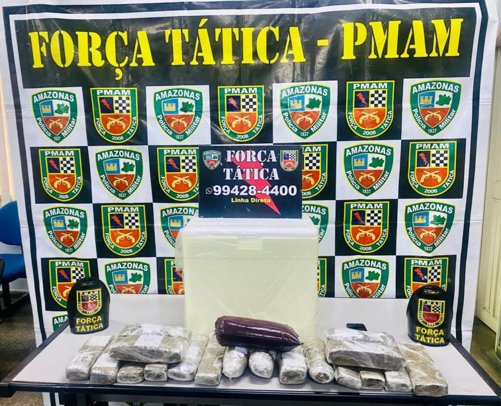 Policiais militares da Força Tática detiveram em flagrante, na manhã desta quarta-feira (17/03), na avenida Nepal, bairro Nova Cidade, zona norte de Manaus, um homem, de 36 anos, por tráfico de entorpecentes, os quais eram embalados em sacos de açaí e despachados para várias cidades do país. Na ação, foram apreendidos aproximadamente 10kg de drogas, divididos em 19 tabletes de substância com aspecto de maconha tipo Skunk.