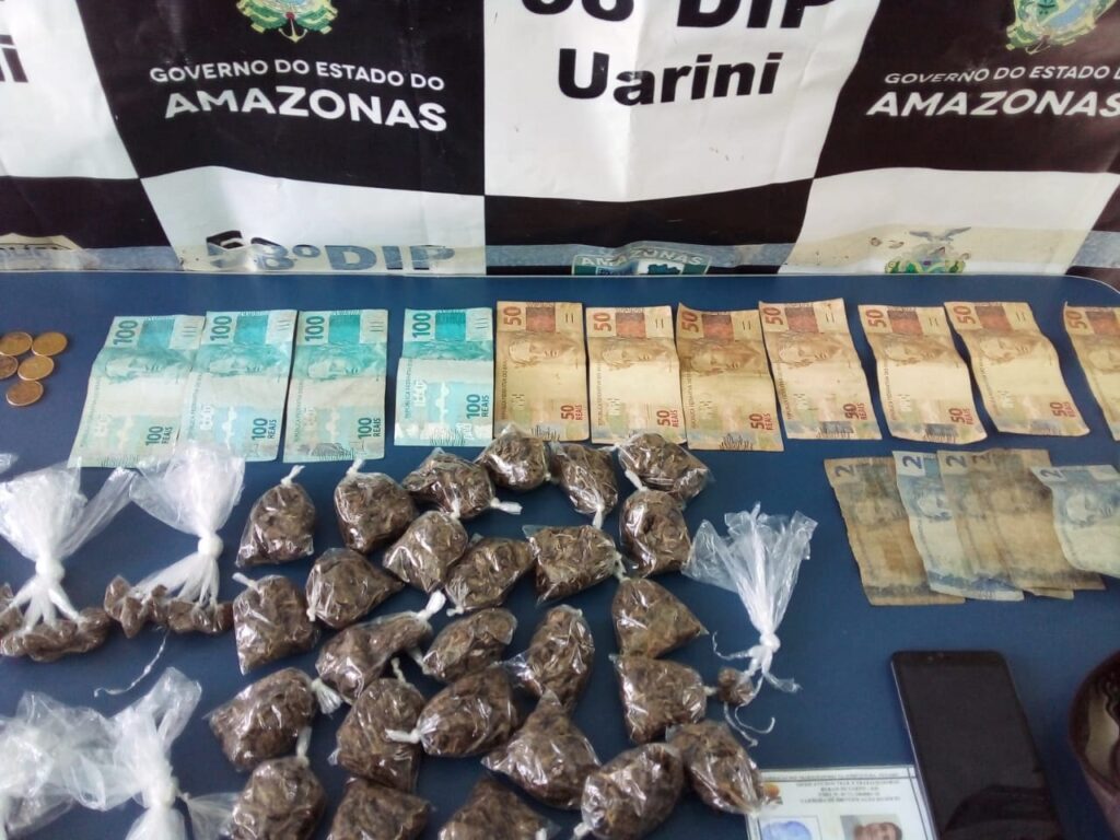 Policiais militares do 2º Grupamento da Polícia Militar (GPM), subordinado ao 3º Batalhão de Polícia Militar (BPM) de Tefé, detiveram por volta das 10h desta quarta-feira (05/05) um homem de 19 anos, flagrado em posse de materiais entorpecentes e dinheiro, no município de Uarini, distante 565 quilômetros de Manaus.