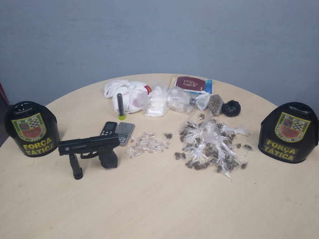 Os policias da Força Tática foram ao local e perceberam um homem com as características da denúncia. O homem, ao perceber a aproximação da equipe, tentou fugir. Os policiais fizeram um cerco e o capturaram. Com ele, foram encontrados um simulacro tipo pistola 24/7, quatro porções de cocaína de 1kg, três porções média de skunk 200g, cinco porções de oxi 300g, 59 trouxinhas de skunk, 52 trouxinhas de oxi, um aparelho celular e uma balança de precisão.