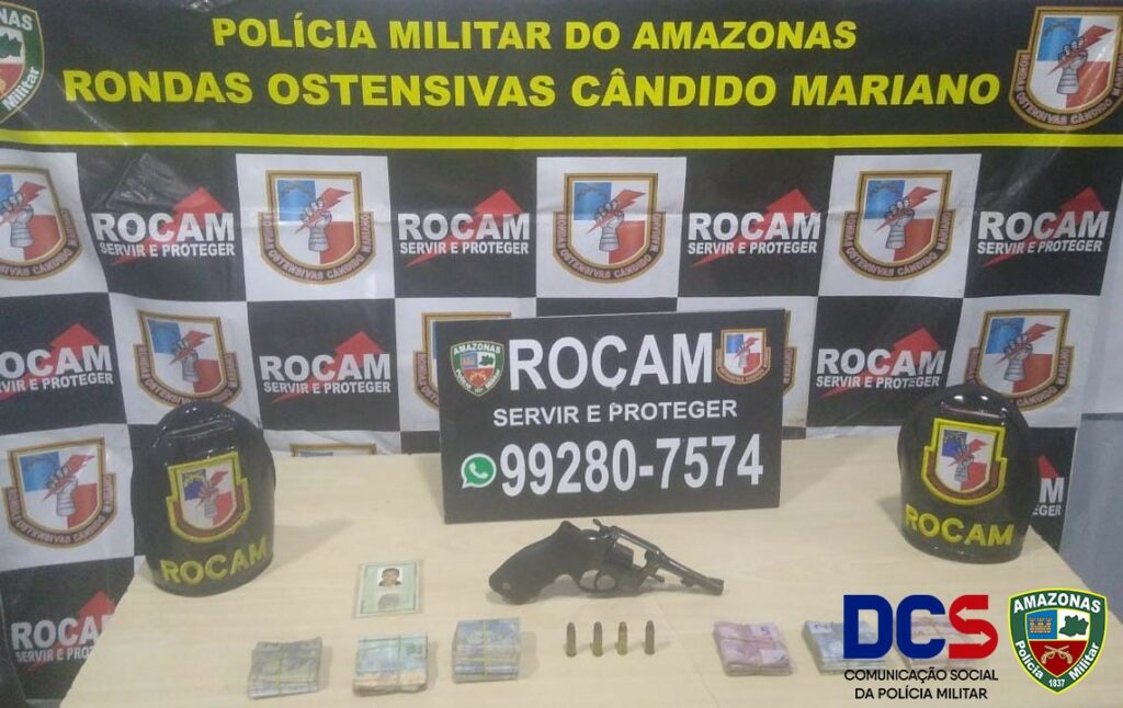 A equipe policial da VTR Rocam 8151 realizava patrulhamento ostensivo de rotina pela avenida Ticuna, no bairro Colônia Terra Nova, quando avistou um homem em atitude suspeita carregando uma sacola. Os policiais abordaram o suspeito e, durante revista pessoal, encontraram com ele uma arma de fogo do tipo revólver, de calibre 38, contendo quatro munições intactas do mesmo calibre, além da importância de R$ 1.653,00 em espécie, que estavam na sacola.