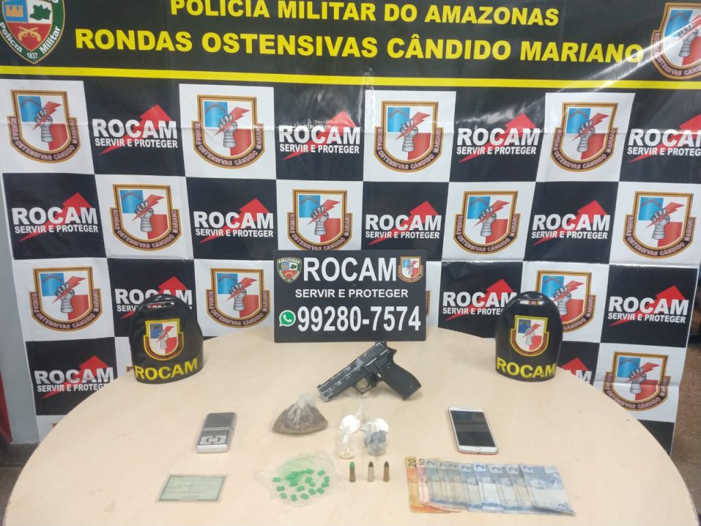 Policiais militares das Rondas Ostensivas Cândido Mariano (Rocam) detiveram, na tarde desta segunda-feira (1º/06), um homem de 28 anos por tráfico de drogas, posse ilegal de munição e posse ilegal de simulacro de arma de fogo, no bairro Coroado, zona leste da capital. Com ele, os policiais apreenderam uma porção grande de supostamente maconha tipo skunk, duas porções pequenas de supostamente cocaína, duas porções pequenas de supostamente oxi, 18 unidades de supostamente drogas sintéticas, uma balança de precisão, um simulacro de arma de fogo, tipo pistola, três munições calibre 38, intactas, um aparelho celular Motorola e a quantia de R$ 46,00 em espécie.