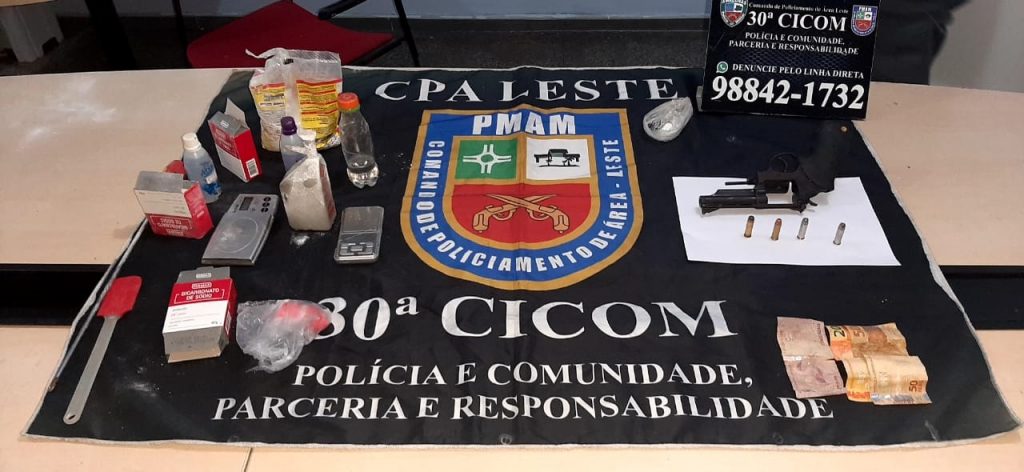 A guarnição policial se deslocou até o endereço informado pelo infrator e ao chegar no local avistou o homem delatado como o portador da arma de fogo e da materialidade ilícita de produção de entorpecentes. Após buscas pela casa do suspeito, a polícia encontrou uma arma de fogo, calibre 38, contendo 4 munições intactas, além de duas balanças de precisão, duas caixas de bicarbonato de sódio, um saco de rejunte e uma quantia de R$ 75,00 em espécie.