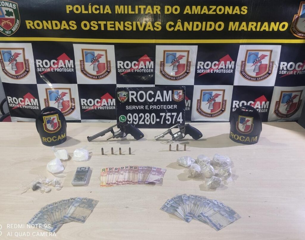Policiais militares das Rondas Ostensivas Cândido Mariano (Rocam) detiveram, na madrugada deste domingo (25/04), dois jovens de 21 e 24 anos, em posse de materiais entorpecentes e armas de fogo. As detenções ocorreram no Residencial Viver Melhor, no bairro Lago Azul, e no bairro Cidade de Deus, ambos na zona norte da capital.