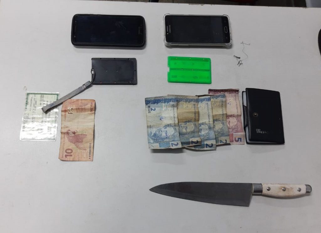 A equipe iniciou as buscas na área do ocorrido, vindo a encontrar o suspeito caminhado pela rua Emílio Moreira. Com ele, os policiais encontraram uma faca do tipo peixeira, dois aparelhos celulares, uma mochila preta, R$ 32,00 em espécie e documentos das três vítimas assaltadas no coletivo.