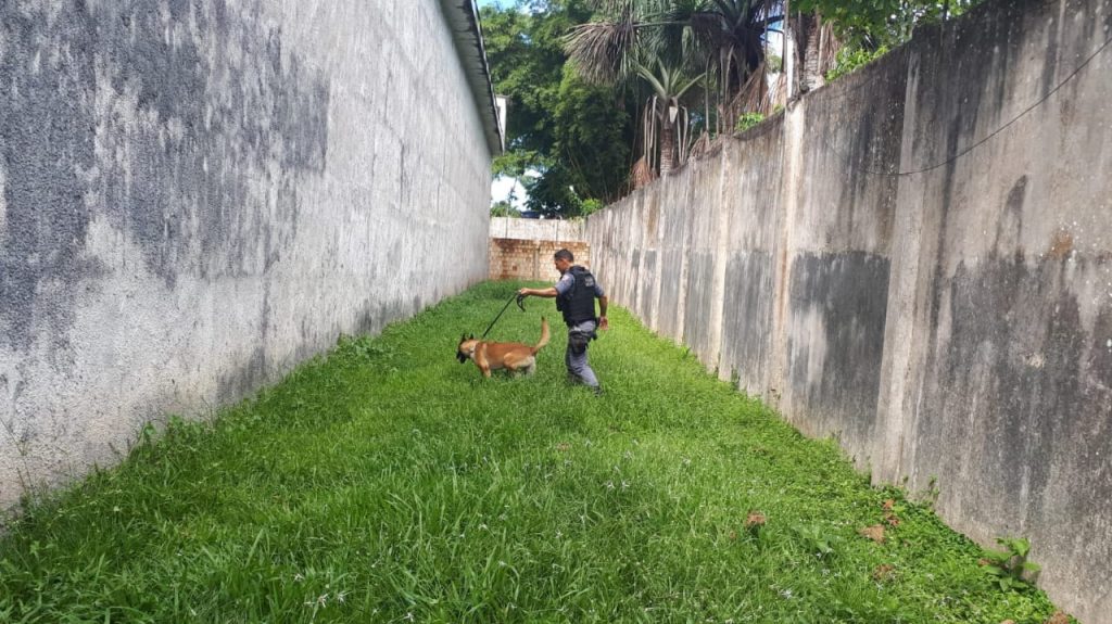Na ação, foi encontrada uma embalagem de cor escura contendo uma substância possivelmente skunk e cocaína, pesando aproximadamente 50g. Os cães farejadores comprovaram a suspeita, dando sinal positivo para substância entorpecente. No invólucro apreendido, foram encontrados substância supostamente skunk pesando aproximadamente 50g, oito papelotes de substância supostamente cloridrato de cocaína e um carregador de aparelho celular.