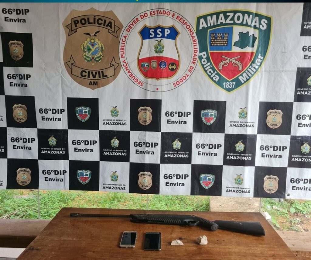 No município de Envira (a 1.208 quilômetros de Manaus), um homem de 18 anos foi preso por tráfico de drogas e porte ilegal de arma de fogo. Com o suspeito, os policiais encontraram uma porção de oxi e uma espingarda. O infrator foi conduzido à 66ª Delegacia Interativa de Polícia (DIP).