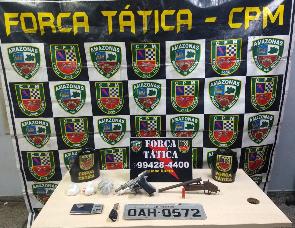 No bairro Alvorada, zona centro-oeste, policiais do Batalhão de Força Tática prenderam um homem de 35 anos com armas de fogo e drogas. A prisão ocorreu após os militares avistarem um veículo em alta velocidade. Durante abordagem, encontraram uma arma de fogo 7.65 na cintura do condutor. No interior do veículo, foi apreendida uma mochila com uma arma de fogo caseira de calibre 32 e porções de drogas, e encontradas marcas de tiro e sangue. Conforme a polícia, o suspeito informou que é de uma facção criminosa e que havia deixado um indivíduo ferido em uma unidade de saúde da capital.