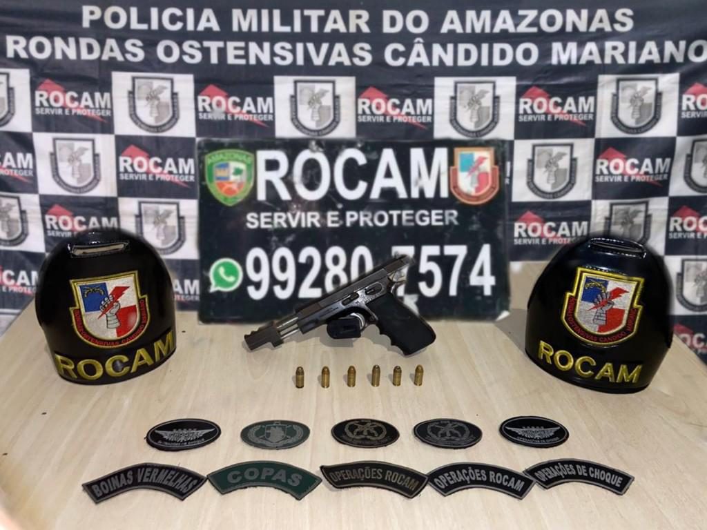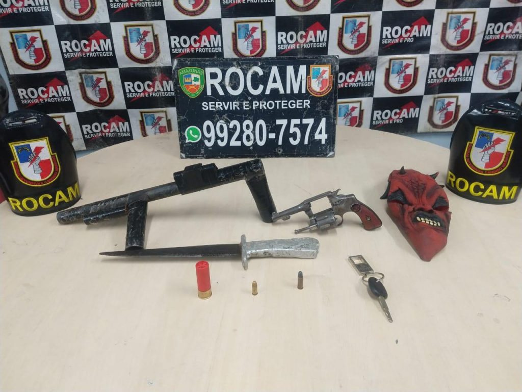 Na avenida Nepal, bairro Nova Cidade, zona norte, a equipe da Rocam prendeu dois homens pelo crime de porte ilegal de arma de fogo. Com a dupla foram encontradas duas arma de fogo, sendo uma espingarda calibre 12 e um revólver calibre 32, e duas munições intactas. Os infratores foram conduzidos ao 14º DIP, na avenida Autaz Mirim, para procedimentos cabíveis.