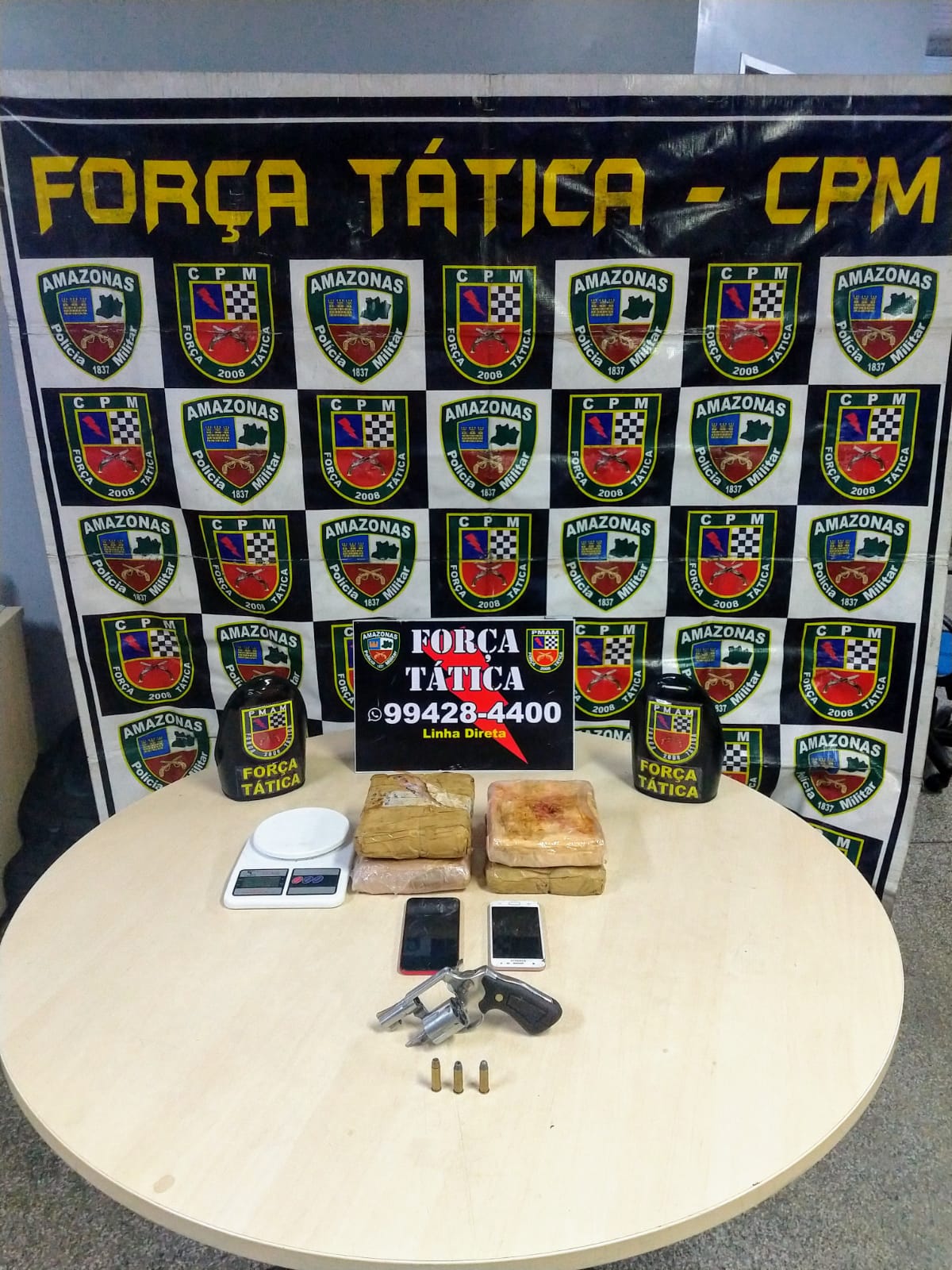 Interior – Em Maués (a 276 quilômetros de Manaus), policiais da 10ª Companhia Independente de Polícia Militar (CIPM) prenderam um homem e apreenderam dois adolescentes pelo crime de porte ilegal de arma de fogo e tráfico de drogas.