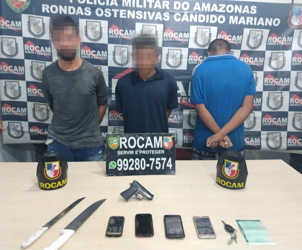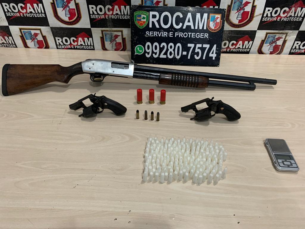Durante patrulhamento no bairro João Paulo, zona leste, policiais militares das Rondas Ostensivas Cândido Mariano (Rocam) prenderam Alexsander William Marques de Souza, 23, Ramesrson da Silva Souza, 31, e Karleandrea Amaral do Nascimento, 18. Com o trio, foram encontrados dois revolveres calibre 38, duas munições uma porção de oxi, duas porções de cocaína, uma porção de skunk.