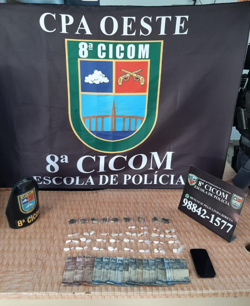 Durante a abordagem, foram encontradas nove porções de entorpecente com características de maconha, 12 porções de entorpecente com aspecto de oxi, 16 porções de substância com aspecto de cocaína, e a quantia de R$ 39 em espécie.