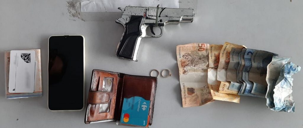 Após ouvir o relato da mulher, detiveram o suspeito, com quem foram encontrados, após revista pessoal, um simulacro de arma de fogo, além dos objetos roubados, reconhecidos pela vítima como sendo de sua propriedade.