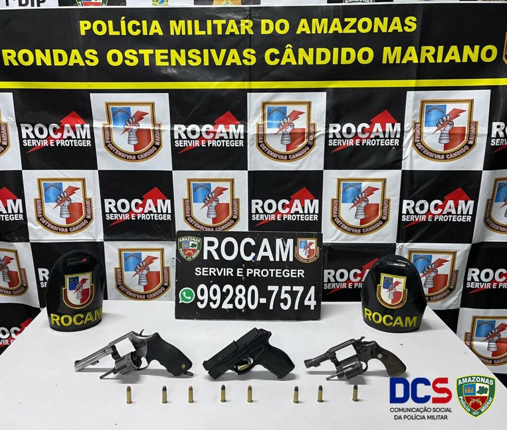 Policiais militares do 2º Batalhão de Policiamento de Choque das Rondas Ostensivas Cândido Mariano (Rocam) prenderam neste sábado (15/05), por volta das 19h30, um homem de 27 anos em posse de duas armas de fogo e um simulacro no bairro Flores, zona centro-sul de Manaus.