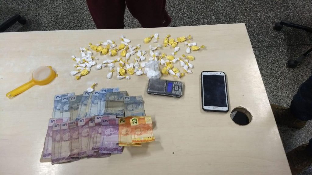 As drogas estavam em uma sacola em cima de uma geladeira. Foram apreendidas 80 trouxinhas e uma porção média supostamente de cocaína, além de uma balança de precisão, uma peneira e R$ 103 em espécie.