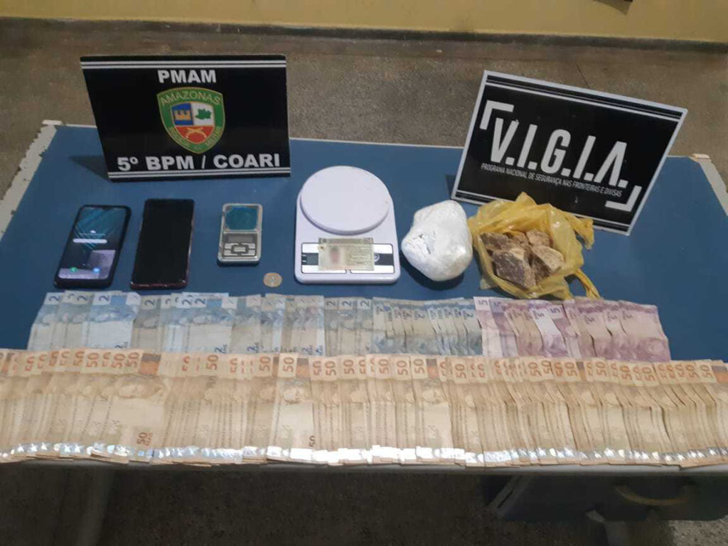 Policiais militares do 5º Batalhão de Polícia Militar (BPM) apreenderam, na noite de terça-feira (16/03), no município de Coari (a 363 quilômetros de Manaus), mais de R$ 5 mil em espécie, 225 pedras de substâncias em formato de pedra com aspecto de cocaína e outras 130 gramas da mesma substância. Um homem de 40 anos, envolvido com o tráfico de drogas na localidade, foi detido.