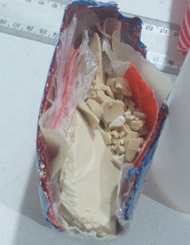 Após varredura no local, foram encontradas 138 gramas de material entorpecente análogo a pasta base de cocaína, um aparelho celular, um relógio de pulso e R$ 4 em dinheiro.