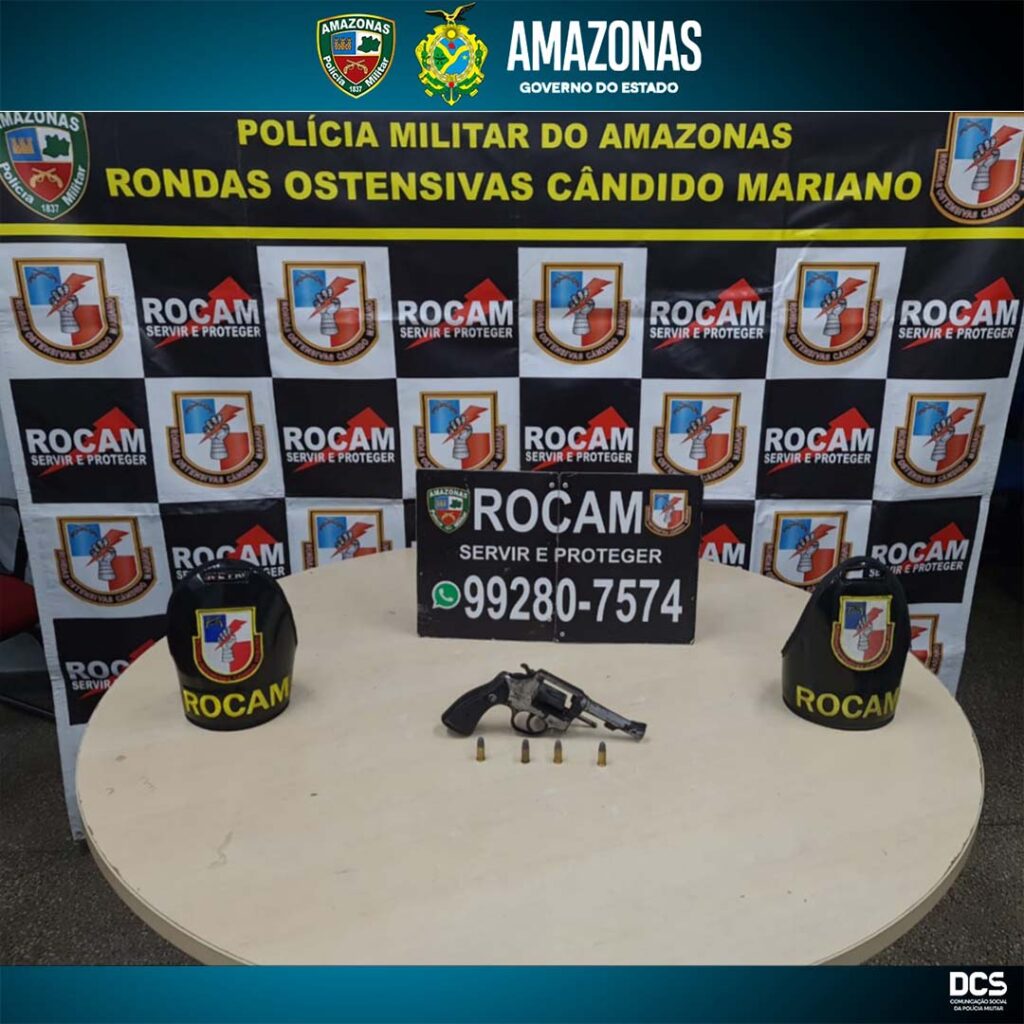 Policiais militares das Rondas Ostensivas Cândido Mariano (Rocam) detiveram, na tarde desta sexta-feira (30/04), um jovem de 18 anos, por posse irregular de arma de fogo, na rua Pingo D’agua, bairro Jorge Teixeira, zona leste de Manaus. Na ação foi apreendido um revólver calibre 38 com quatro munições intactas