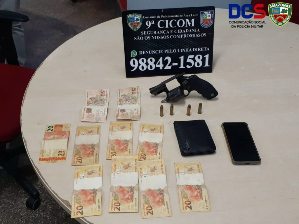 Com apoio das viaturas de área, os policiais localizaram a motocicleta em um terreno com várias residências, onde foram informados que o suspeito morava nas proximidades. No momento em que retornava para a moto, o homem foi abordado e reconhecido pela vítima como autor do roubo. Após as buscas no local, os policiais encontraram um revólver calibre 38, marca Taurus, com quatro munições intactas e numeração E.B 4686.