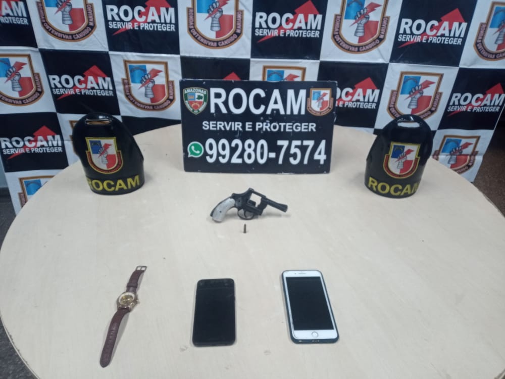 Os militares da equipe Rocam 7931, durante patrulhamento pela zona leste, por volta das 22h, foram acionados por populares informando que um indivíduo a pé estaria cometendo roubo de celulares e ameaçando as vítimas com uma arma de fogo, nas imediações da avenida Autaz Mirim, bairro São José. A equipe saiu em buscas no local e localizou o indivíduo a partir das características informadas.