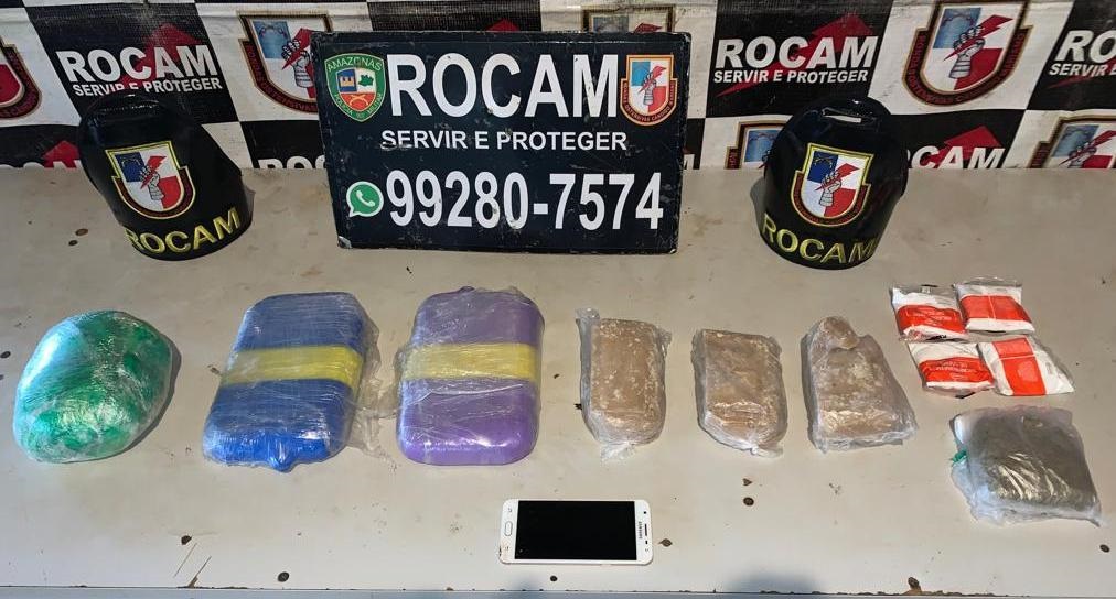 A equipe das Rondas Ostensivas Cândido Mariano (Rocam), durante ação em Maués (distante 276 quilômetros da capital), prendeu um homem de 33 anos. Em sua casa, a PM encontrou um quilo de cocaína e quatro quilos de oxi. Ele já tem uma passagem pela polícia por porte ilegal de arma de fogo e foi destinado à 48ª DIP para os procedimentos legais.