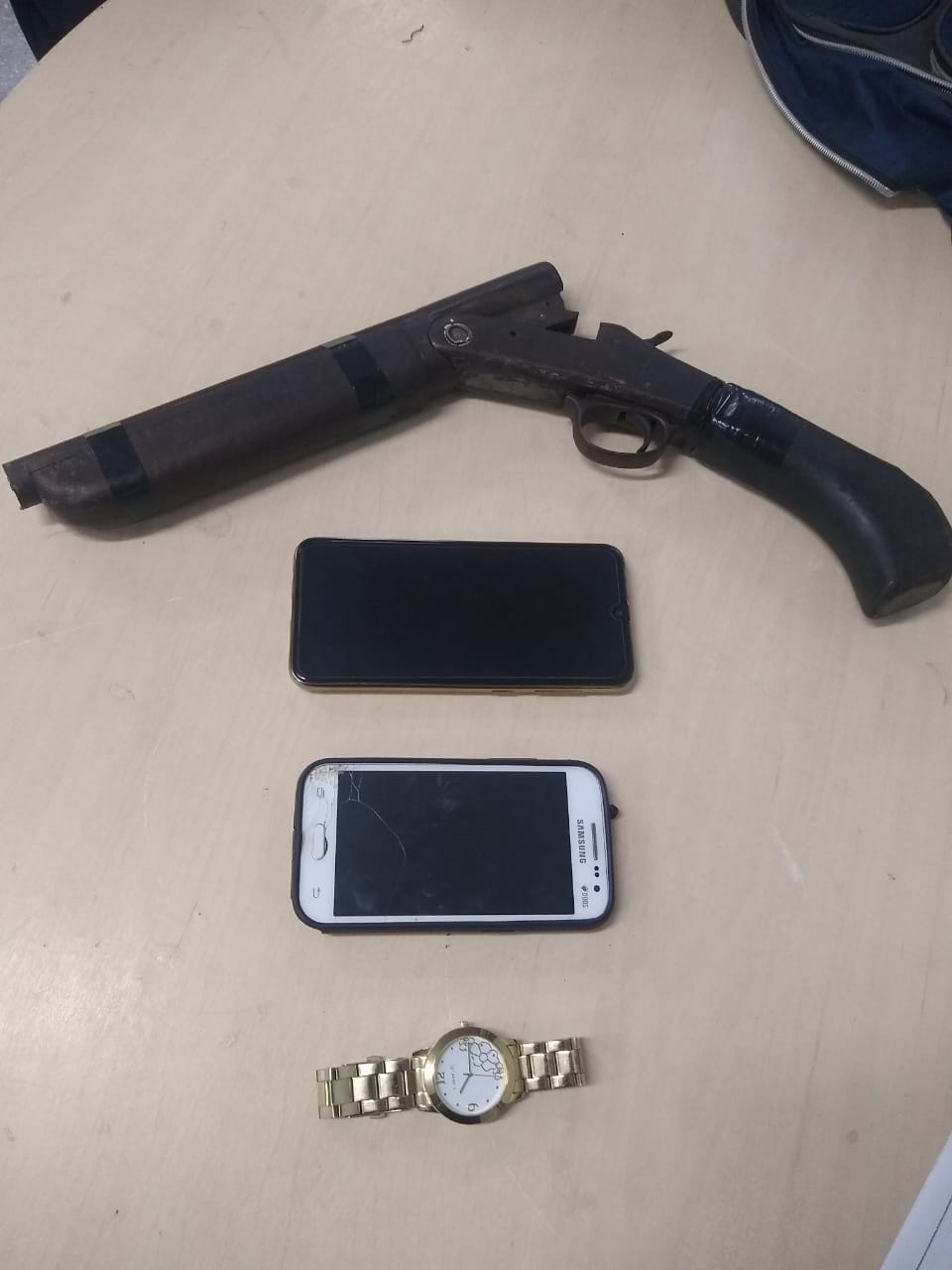 Policiais Militares da 14ª Companhia Interativa Comunitária (Cicom) detiveram, na noite desta sexta-feira (03), um homem e apreenderam três menores suspeitos de roubo e porte ilegal de arma de fogo no bairro Tancredo Neves, zona Leste da capital. Com eles, os policiais apreenderam uma arma de fogo de fabricação caseira, um relógio de pulso dourado e dois aparelhos celulares possivelmente roubados.