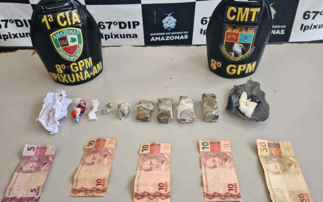 Policiais militares do 8ª Grupamento de Polícia de Militar (GPM) apreenderam um adolescente de 17 anos e prenderam outros dois homens, de 19 e 56 anos, no município de Ipixuna (a 1.367 quilômetros da capital). Com eles, os policiais encontraram porções de oxi e maconha. O infrator foi encaminhado à 67ª DIP.