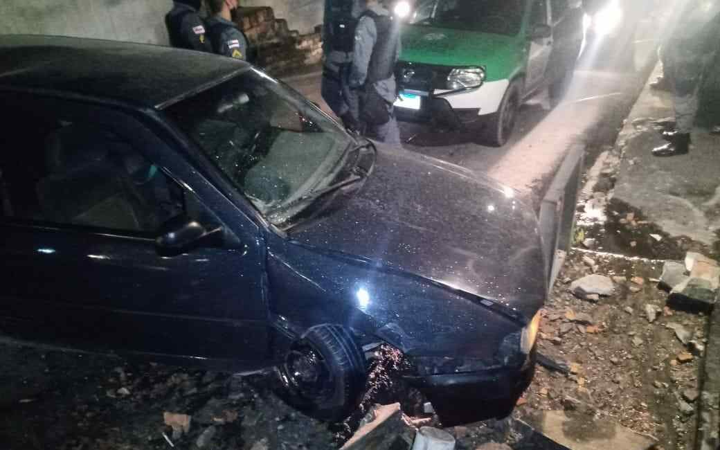 A guarnição iniciou buscas e avistou os suspeitos na rua São Francisco, ao que emitiu ordem de parada. Os suspeitos fugiram e foram acompanhados até colidirem com o muro de duas residências na rua Laura Vicuña. Em revista aos suspeitos e no interior do veículo, os policiais encontraram aparelhos celulares que eram fruto de roubo e um simulacro de arma de fogo, e também identificaram que o carro utilizado por eles era roubado.