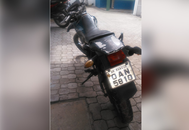 Com eles foram encontradas uma motocicleta Yamaha, branca, placa adulterada OAN-5819, com restrição de furto, além de três armas caseiras e três munições de calibre 12, 20 e 28. A placa original da motocicleta é JXS-1851.