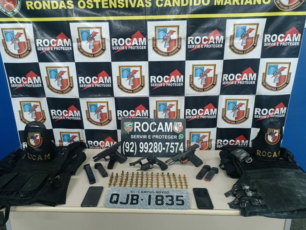 A Polícia Militar do Amazonas (PMAM), por meio das Rondas Ostensivas Cândido Mariano (Rocam), apreendeu três armas de fogo, munições e um veículo com restrição, na noite de quarta-feira (18/09). A ação policial aconteceu após confronto com facção criminosa, no bairro Tarumã, zona oeste de Manaus.
