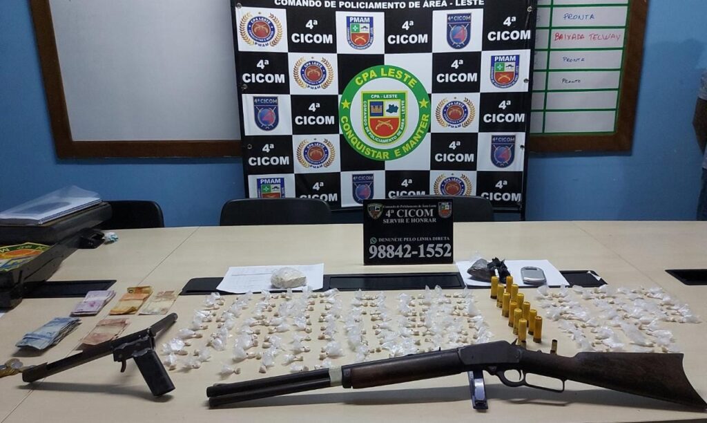 Policiais militares na zona leste de Manaus, guarnições das viaturas da 4ª Companhia Interativa Comunitária (Cicom), na madrugada desta quarta-feira (25/08), apreenderam dois adolescentes, de 14 e 16 anos, e detiveram um jovem de 19, todos flagrados em posse de materiais entorpecentes, armas de fogo e dinheiro, em uma residência na rua Yasmin, Nova Vitória, bairro Gilberto Mestrinho.