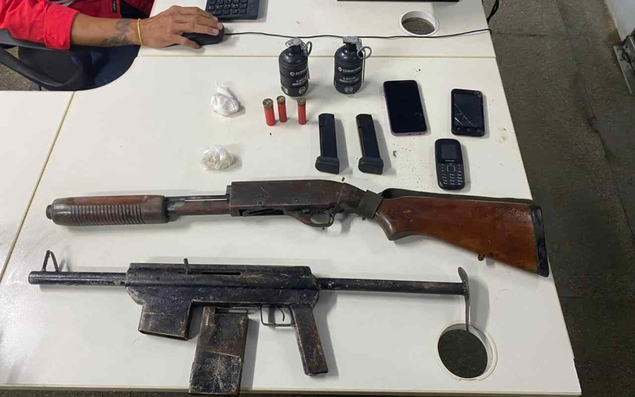 Na sacola da qual o suspeito havia se desfeito foram encontrados uma espingarda calibre 12; uma submetralhadora artesanal calibre 28; duas granadas; dois carregadores de pistola calibre 40; três munições calibre 28; uma munição calibre 16; quatro aparelhos celulares; e duas porções de entorpecentes semelhantes a oxi.