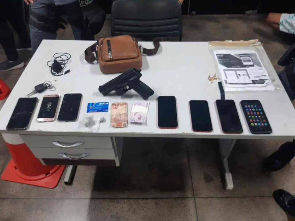 Em posse dos infratores foram encontrados um simulacro de pistola e uma bolsa com sete aparelhos celulares. Todos os suspeitos, juntamente com o material apreendido, foram levados para o 19º DIP.