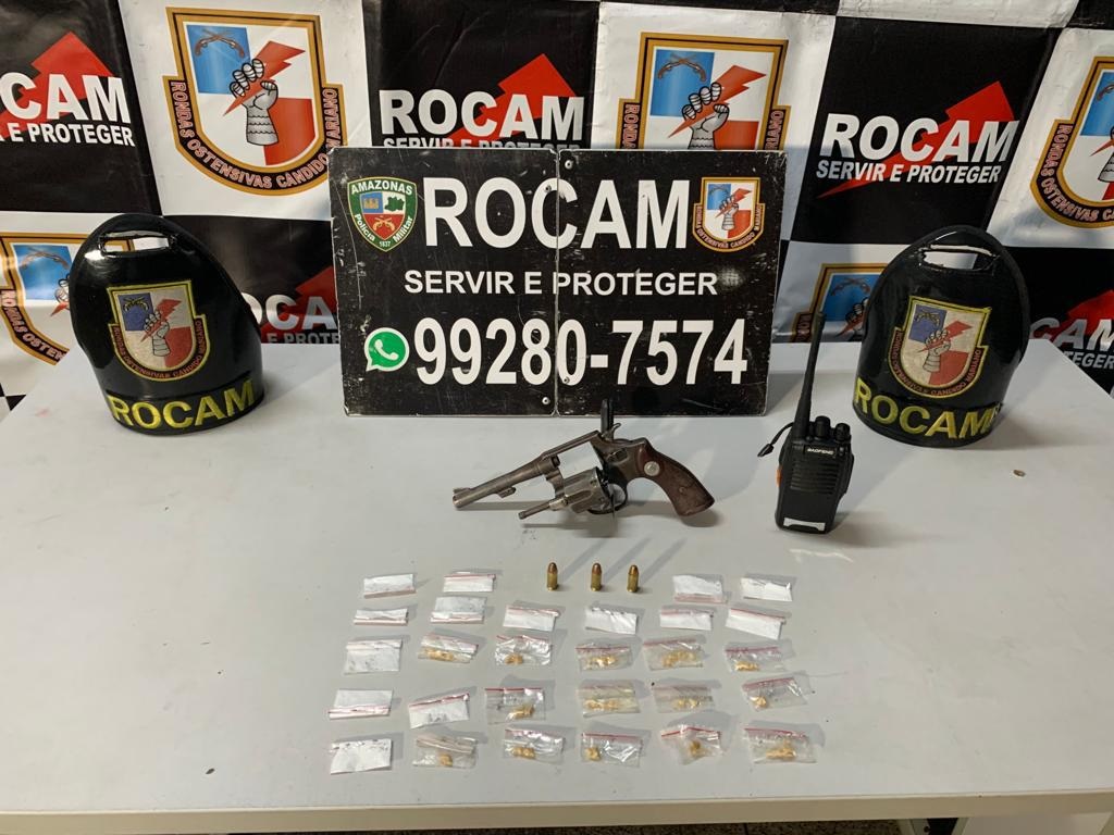 Policiais militares das Rondas Ostensivas Cândido Mariano (Rocam) prenderam um homem, de 29 anos, no bairro Centro, zona sul de Manaus. Durante a abordagem, a guarnição encontrou um revólver calibre 32, três munições, 14 trouxinhas de cocaína, 14 trouxinhas de oxi e um rádio comunicador. O infrator foi apresentado ao 1° DIP e autuado em flagrante pelos crimes de tráfico de drogas e porte ilegal de arma de fogo.
