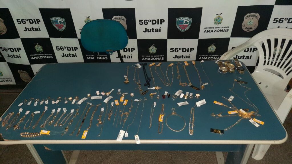 Policiais militares do 6º Grupamento de Polícia Militar (GPM) do 3º Batalhão de Polícia Militar (BPM), na noite de segunda-feira (07/06), detiveram dois homens, de 36 e 41 anos, em fuga após furto de várias joias, como pulseiras, cordões, anéis, gargantilhas, tornozeleiras, relógios e diversos celulares smartphones, avaliados em mais de R$ 100 mil, em um comércio na rua Cícero Tuchaua, no bairro Centro, do município de Jutaí, distante 751 quilômetros em linha reta de Manaus.