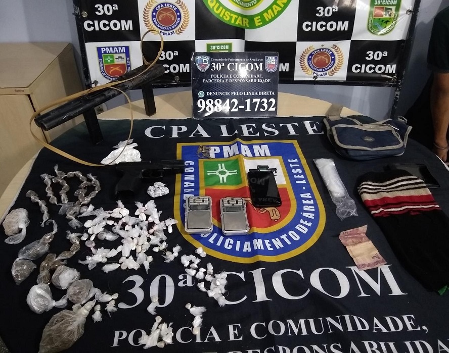 Na tarde de segunda-feira (14/09), policiais militares da 30ª Companhia Interativa Comunitária (Cicom) detiveram dois homens, de 24 e 25 anos, por porte ilegal de arma de fogo e tráfico de drogas, no bairro Jorge Teixeira, na zona leste de Manaus. A ação ocorreu durante uma das incursões promovidas pelo Centro de Policiamento de Área (CPA) Leste, que tem realizado diversas ações pelos bairros que compõem a área de atuação da unidade, visando a repressão dos crimes de tráfico de drogas.