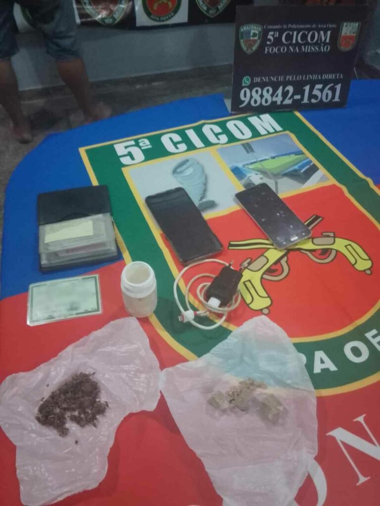Policiais militares da 5ª Companhia Interativa Comunitária (Cicom) prenderam, na noite da terça-feira (09/11), um homem de 36 anos encontrado com aparelho celular e material entorpecente, em fato ocorrido no bairro Santo Antônio, zona oeste de Manaus.