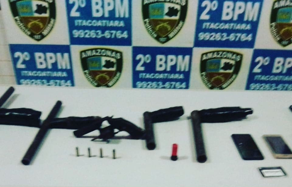 Policiais militares do 2º Batalhão de Polícia Militar (BPM) detiveram no sábado (04/09) quatro indivíduos, de idades não informadas, e apreenderam com eles duas armas de fogo artesanais e um revólver, em Itacoatiara (a 176 quilômetros da capital).