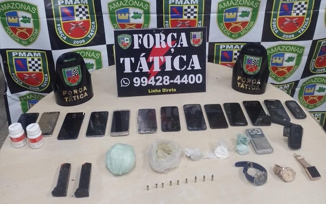 Com eles foram apreendidas cinco porções de cocaína e oxi; três munições intactas calibre .22; seis munições deflagradas do mesmo calibre; um carregador de PT/840, n° 56951 marca Taurus e um carregador de PT27/4, marca Taurus; 13 aparelhos celulares; e uma balança de precisão. O caso foi conduzido ao 14º Distrito Integrado de Polícia (DIP).
