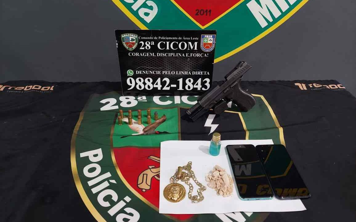 No bairro Novo Aleixo, zona norte, a equipe MT Rocam 04 apreendeu três armas de fogo, 13 munições, 199 trouxinhas e cinco porções de entorpecentes de variados tamanhos. A ação ocorreu por volta das 21h, em patrulhamento ostensivo pela rua 02, quando os militares avistaram um homem em atitude suspeita. O indivíduo ainda tentou fugir, mas foi alcançado pelos policiais.