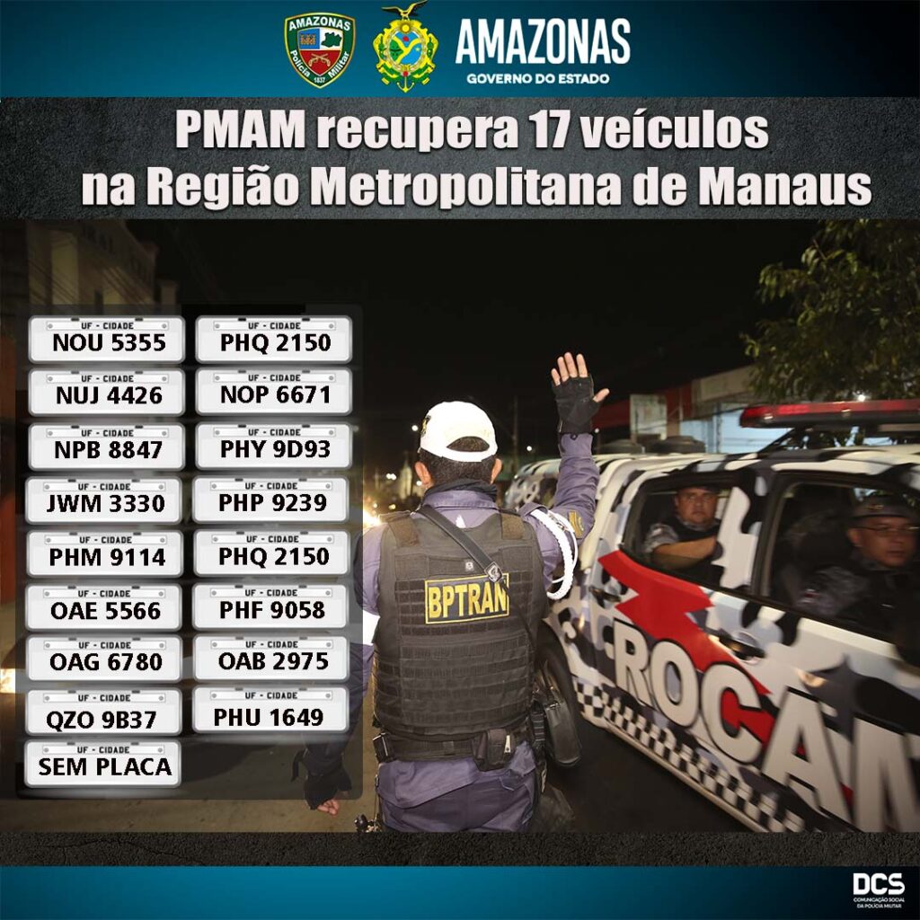 No último fim de semana, policiais militares das Rondas Ostensivas Cândido Mariano (Rocam), do Batalhão de Policiamento de Trânsito (BPTran) e das 4ª, 8ª, 11ª, 12ª, 13ª, 18ª, 24ª 25ª e 30ª Companhias Interativas Comunitárias (Cicoms) recuperaram 17 veículos em situação de roubo ou furto, em ações distintas nas zonas norte, sul, centro-sul, leste e oeste de Manaus e no município de Iranduba, localizado na Região Metropolitana.