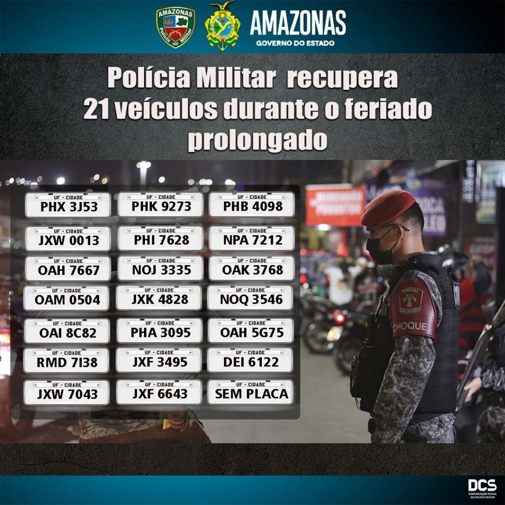 Durante o feriado prolongado, entre o sábado (04/09) e a terça-feira (07/07), a Polícia Militar do Amazonas (PMAM) localizou e recuperou 21 veículos com restrição de roubo ou furto, em ações distintas das 1ª, 2ª, 5ª, 8ª, 12ª, 14ª, 18ª, 19ª, 26ª, e 30ª Companhias Interativas Comunitárias (Cicoms) nas zonas norte, sul, centro-sul, leste e oeste de Manaus.