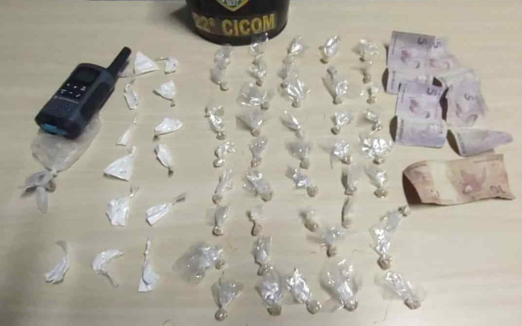 Durante revistas pessoais, os policiais encontraram 40 trouxinhas de substância entorpecente com aparência de oxi, 17 trouxinhas de cocaína, uma trouxinha de maconha e R$ 30 em espécie.