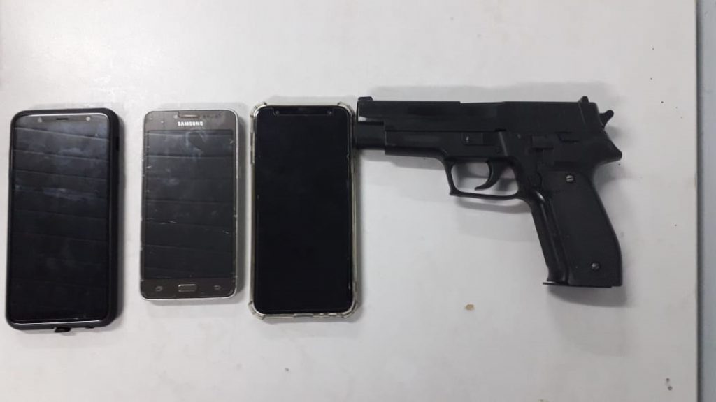 Durante revista pessoal, os policiais encontraram o simulacro de arma de fogo e os telefones supostamente roubados. Diante dos fatos, foi dada voz de prisão aos suspeitos que foram conduzidos ao 1º Distrito Integrado de Polícia (DIP) para os procedimentos legais.