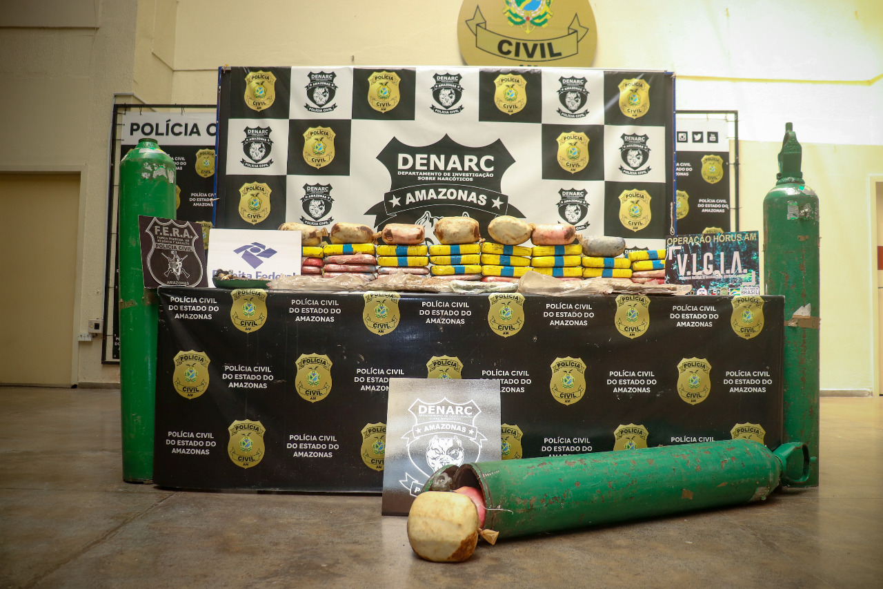 Uma ação deflagrada por agentes do Departamento de Investigação sobre Narcóticos (Denarc), com o apoio das equipes do Grupo Força Especial de Resgate e Assalto (Fera), e da Receita Federal, na tarde de domingo (16/08), por volta das 16h, resultou na apreensão de 62 quilos de droga, sendo 32 de maconha do tipo skunk e 30 de cocaína. O material foi encontrado em cilindros de oxigênio, no interior de um avião bimotor que pousou no aeroclube de Manaus, situado no bairro Flores, zona centro-sul da cidade.