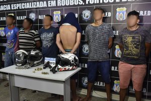 A Polícia Civil do Amazonas, por meio das equipes de investigação da Delegacia Especializada em Roubos, Furtos e Defraudações (Derfd), sob o comando do delegado Adriano Felix, titular da unidade policial, deflagrou na tarde desta quinta-feira (1º/03), ação policial que resultou nas prisões, em flagrante, de Adair José Marques Teixeira, 23; Erick Luan Dias Ribeiro, 22; do flanelinha Ocimar Freitas de Oliveira, 38; Odairis da Silva Borges, 28, conhecido como “Pará”, e Vanglesson Pereira Farias, 26, por tentativa de roubo majorado e associação criminosa. Durante a ação, um adolescente de 17 anos foi apreendido por envolvimento com o bando.